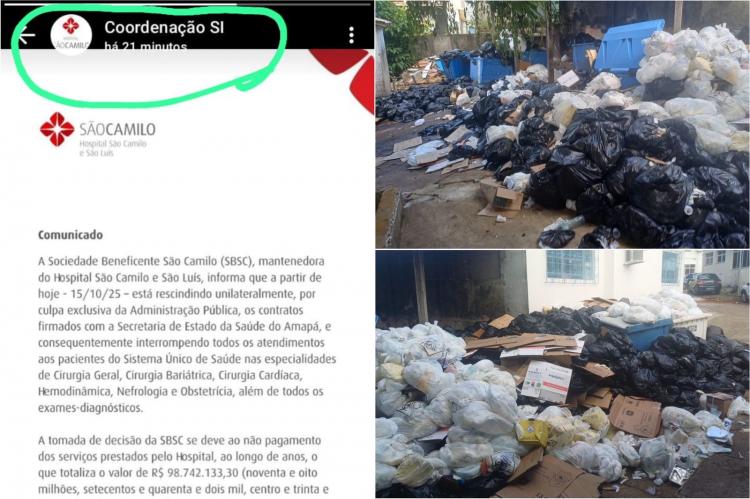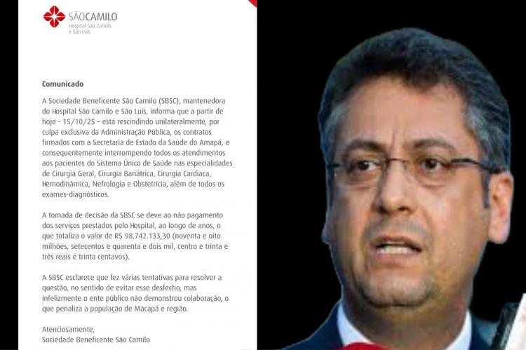 A Sociedade Beneficente São Camilo (SBSC), mantenedora do Hospital São Camilo e São Luís, informou através de nota que o contrato com o governo do Amapá está reicindido a partir de hoje - 15/10/25.