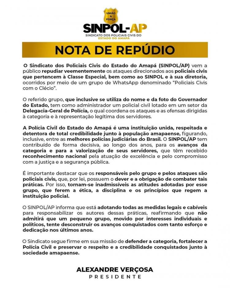 O Sindicato dos Policiais Civis do Estado do Amapá (SINPOL/AP) publicou uma nota de repúdio denunciando a existência de um grupo de WhatsApp denominado “Policiais Civis com o Clécio”, que estaria sendo usado para promover ataques políticos e institucionais contra a diretoria sindical e policiais da Classe Especial.