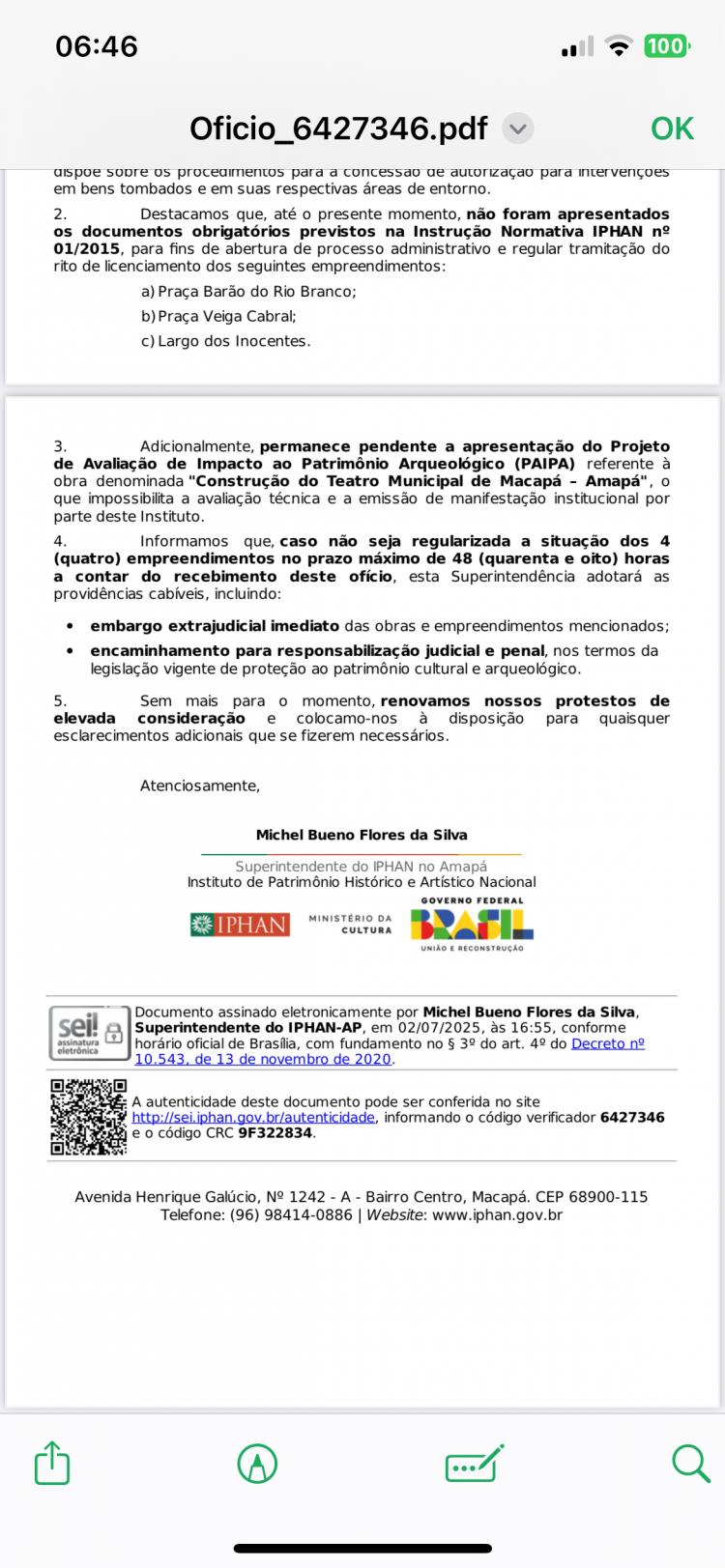 “Destacamos que, até o presente momento, não foram apresentados os documentos obrigatórios previstos na Instrução Normativa IPHAN nº 01/2015, para fins de abertura de processo administrativo e regular tramitação do rito de licenciamento dos seguintes empreendimentos: a) Praça Barão do Rio Branco; b)Praça Veiga Cabral; c) Largo dos Inocentes. 3. Adicionalmente, permanece pendente a apresentação do Projeto de Avaliação de Impacto ao Patrimônio Arqueológico (PAIPA) referente à obra denominada "Construção do Teatro Municipal de Macapá – Amapá", o que impossibilita a avaliação técnica e a emissão de manifestação institucional por parte deste Instituto”, diz o documento.