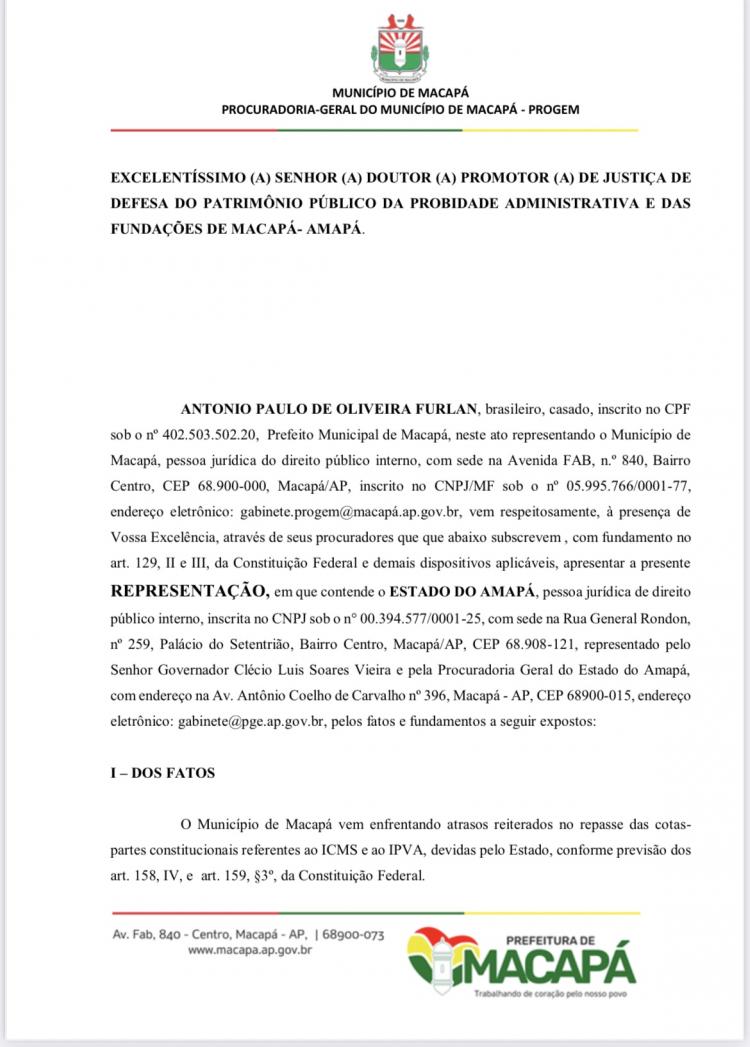 “Os repasses, que deveriam ocorrer de forma regular e tempestiva, vêm sendo realizados com atrasos significativos desde o ano de 2024, comprometendo seriamente as finanças municipais, o pagamento de servidores, fornecedores e a manutenção de serviços públicos essenciais, como saúde, educação e limpeza urbana”, informa a Procuradoria Geral do Município, em denúncias protocoladas no MP/AP, TCE/AP e no Mandado de Segurança no TJ/AP.