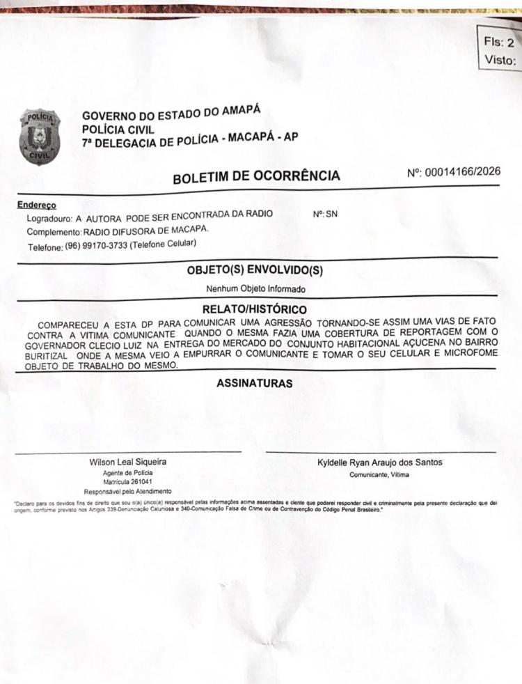 “Compareceu a esta DP para comunicar uma agressão tornado-se assim uma vias de fato contra a vítima comunicante quando a mesma fazia uma cobertura de reportagem com o governador Clécio Luis na entre do Mercado do Conjunto habitacional Açucena no Bairro Buritizal onde a mesma veio a empurrar o comunicante e tomar o celular e microfone objeto de trabalho do mesmo”, relata a vítima.