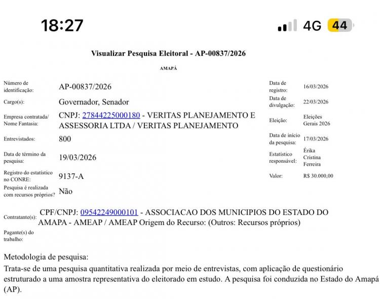 Uma pesquisa eleitoral registrada no TSE (AP-00837/2026), sobre a disputa ao Governo do Amapá e ao Senado, já levanta questionamentos antes mesmo da divulgação, prevista para 22 de março.