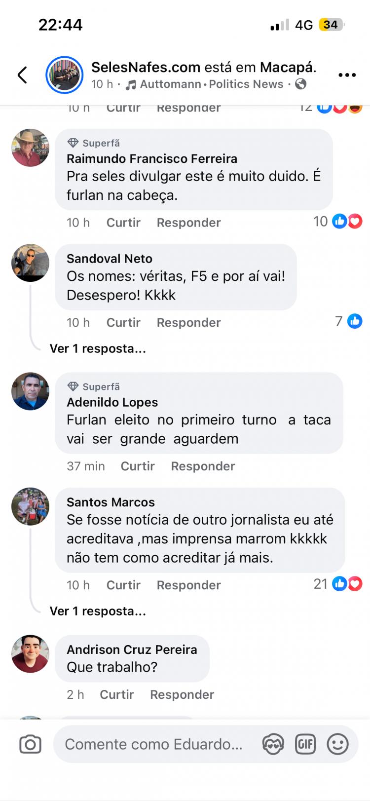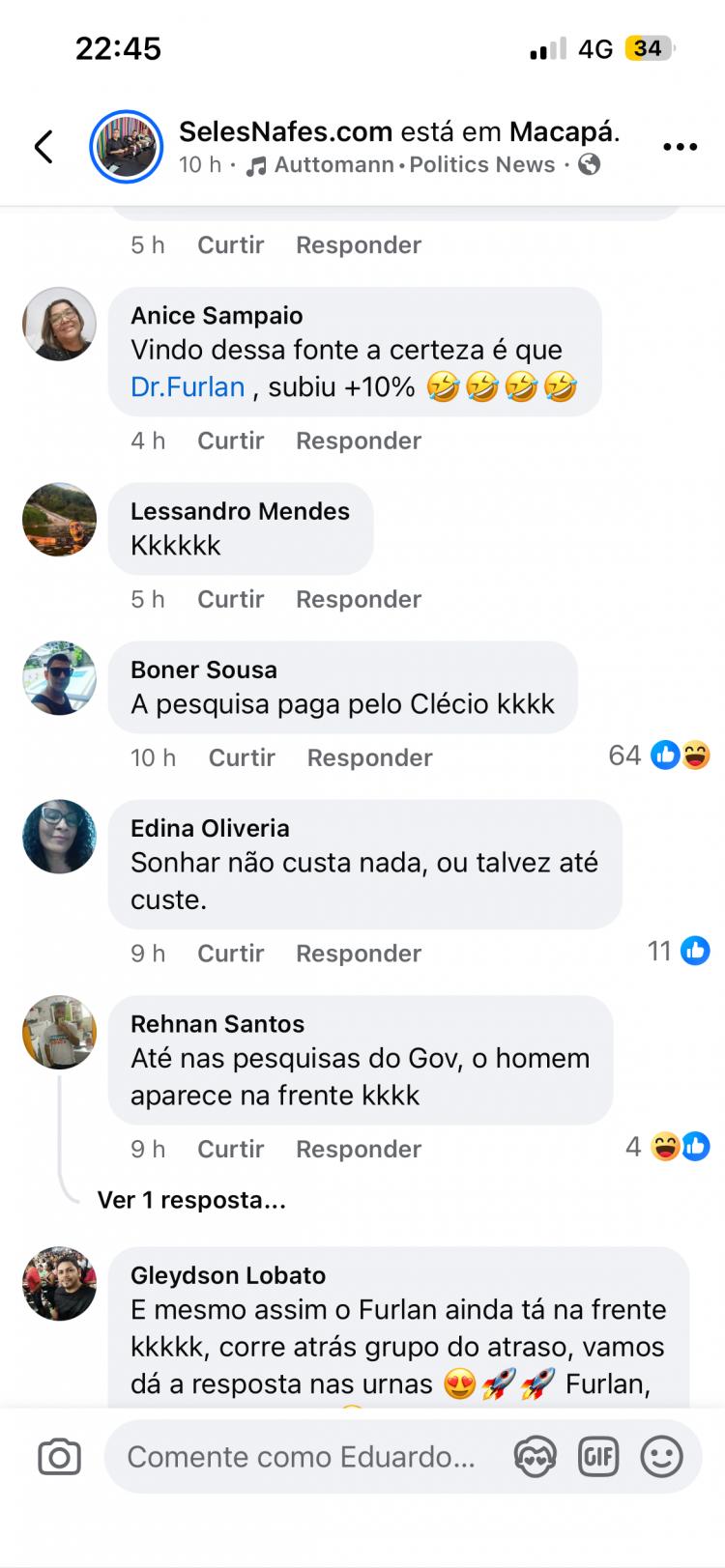 O fato da pesquisa ter sido bancada pela AMEAP, entidade presidida por Carlos Sampaio, aliado de Clécio, alimentou comentários irônicos. A frase “e mesmo assim o Furlan ainda tá na frente” sintetiza o tom das postagens, que tratam o resultado como constrangedor para o grupo do governador, já que no início da semana passada a Paraná Pesquisa apontou 65,1% para Dr. Furlan contra 25,3% de Clécio e não ocorreu nenhum fato novo nos últimos dias que tivesse mudança no cenário como apontou a Véritas.