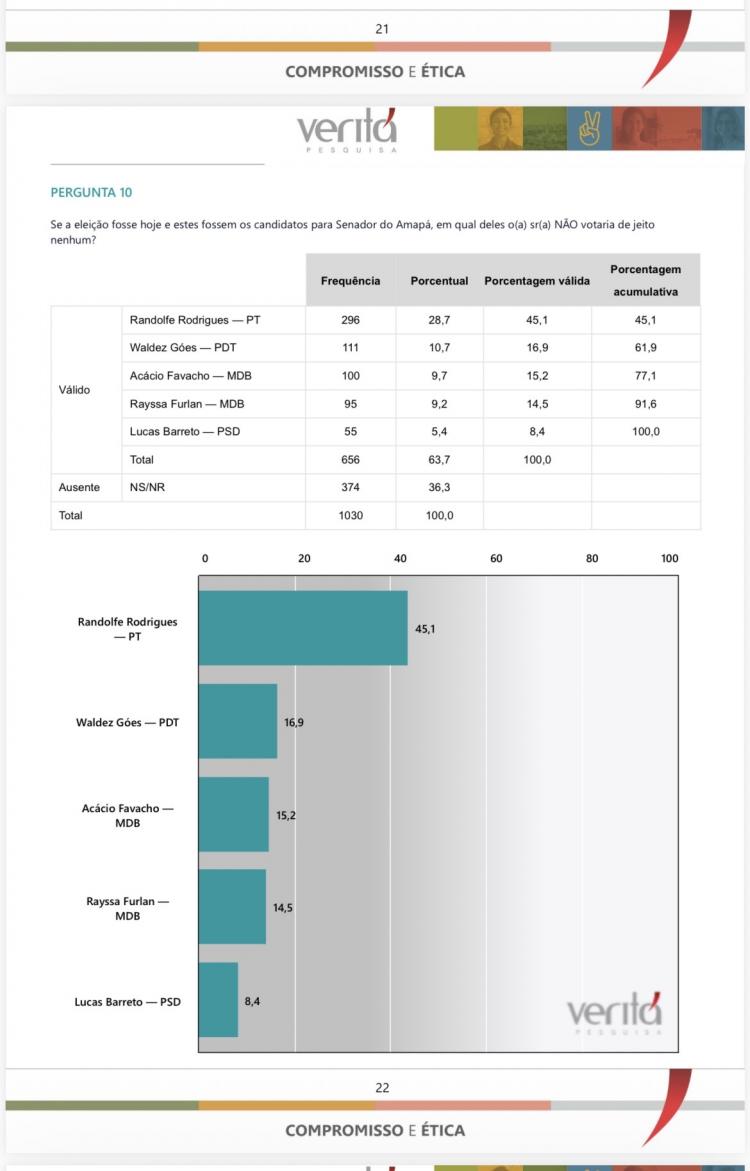 Os números da pesquisa do Instituto Veritá na corrida eleitoral no Amapá chamam atenção para rejeição do líder do governo Lula no Congresso Nacional, o senador Randolfe Rodrigues (PT).