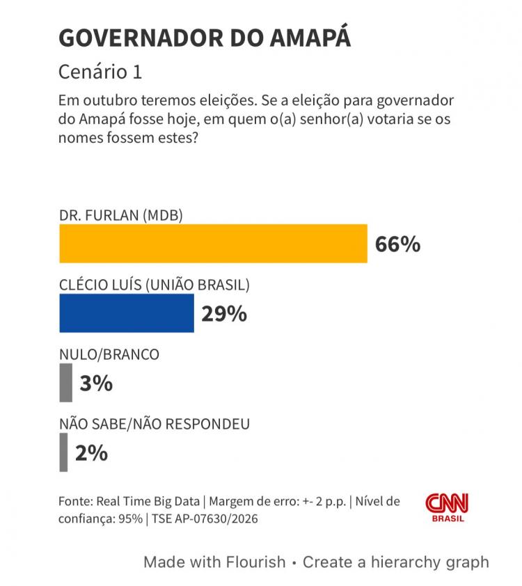 O prefeito de Macapá, Dr. Furlan (MDB), aparece à frente do governador do Amapá, Clécio Luís (Solidariedade), em uma eventual disputa para governador do estado nas eleições de 2026, segundo pesquisa do instituto Real Time Big Data divulgada nesta terça-feira (10).