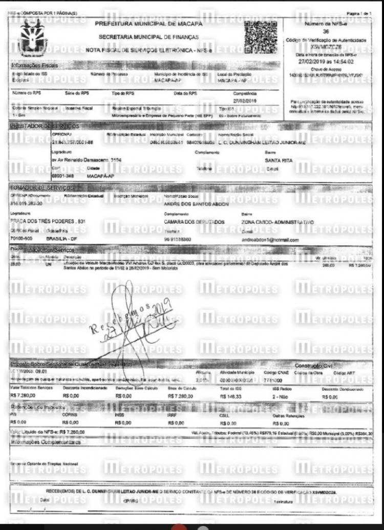 Há uma emissão de nota fiscal para locação de veículo ao próprio parlamentar em 27 de fevereiro de 2019, no valor de R$ 7,2 mil.