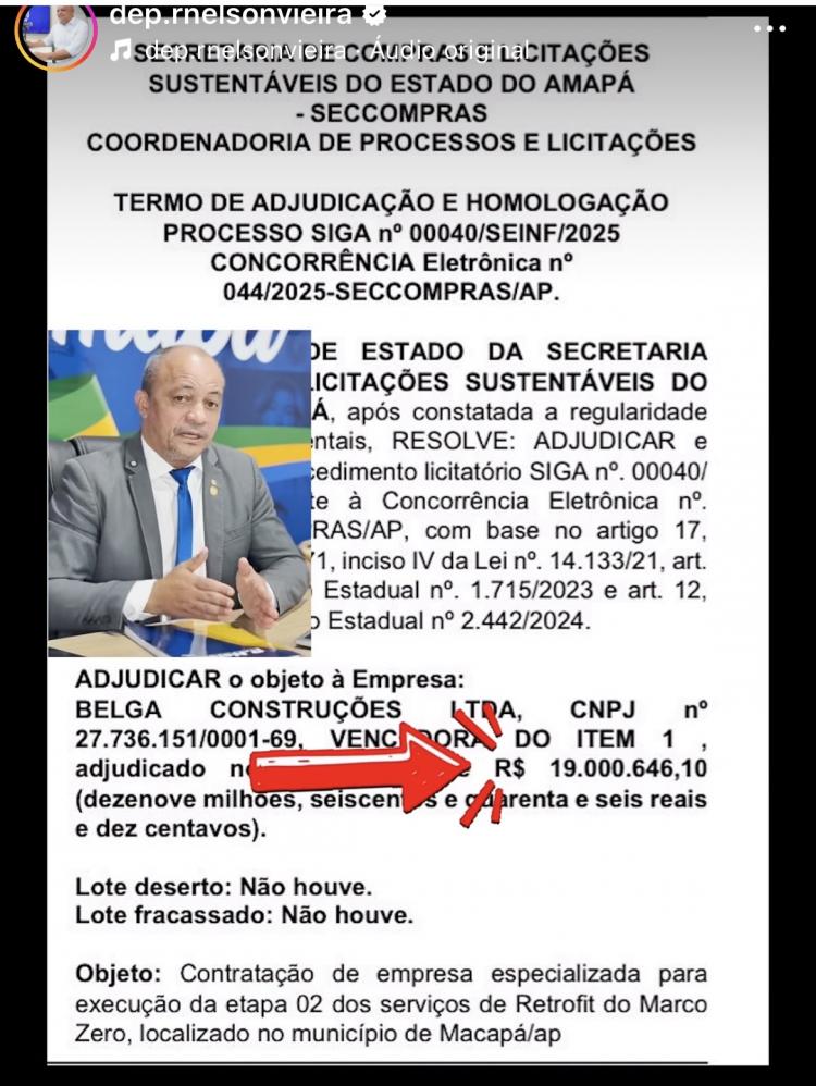 O deputado estadual R. Nelson Vieira (PL) denunciou nas redes sociais um novo aditivo do governo Clécio Luís (União Brasil) para a reforma do Monumento Marco Zero. Segundo o parlamentar, o custo total da obra ultrapassa R$ 27 milhões — valor que supera a construção do Parque do Meio do Mundo, executada pelo ex-prefeito Dr. Furlan (PSD), que custou pouco mais de R$ 22 milhões.