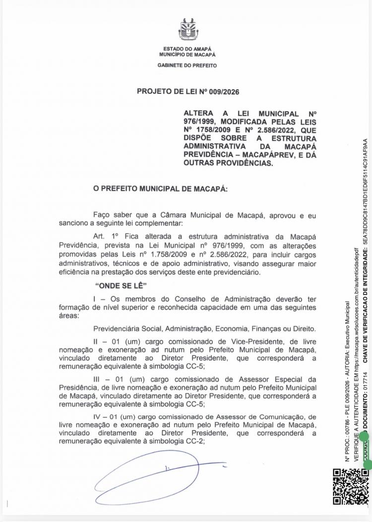 O prefeito interino de Macapá, Pedro DaLua (União Brasil), que dias atrás reuniu a imprensa para alertar que a Macapá Previdência (MacapaPrev) teria recursos para cobrir aposentadorias e pensões por apenas 7 meses, sancionou uma lei complementar criando diversos cargos comissionados no órgão.