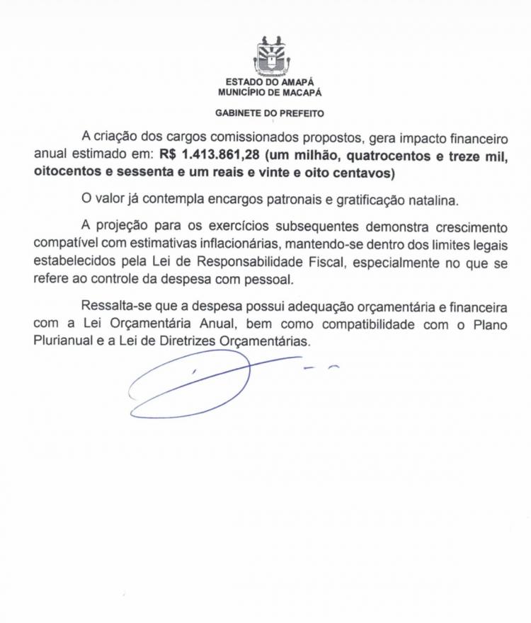 O impacto financeiro anual estimado da nova estrutura é de R$ 1.413.861,28. A lei foi aprovada pela Câmara Municipal de Macapá e altera a Lei Municipal nº 976/1999, já modificada pelas Leis nº 1.758/2009 e nº 2.586/2022.